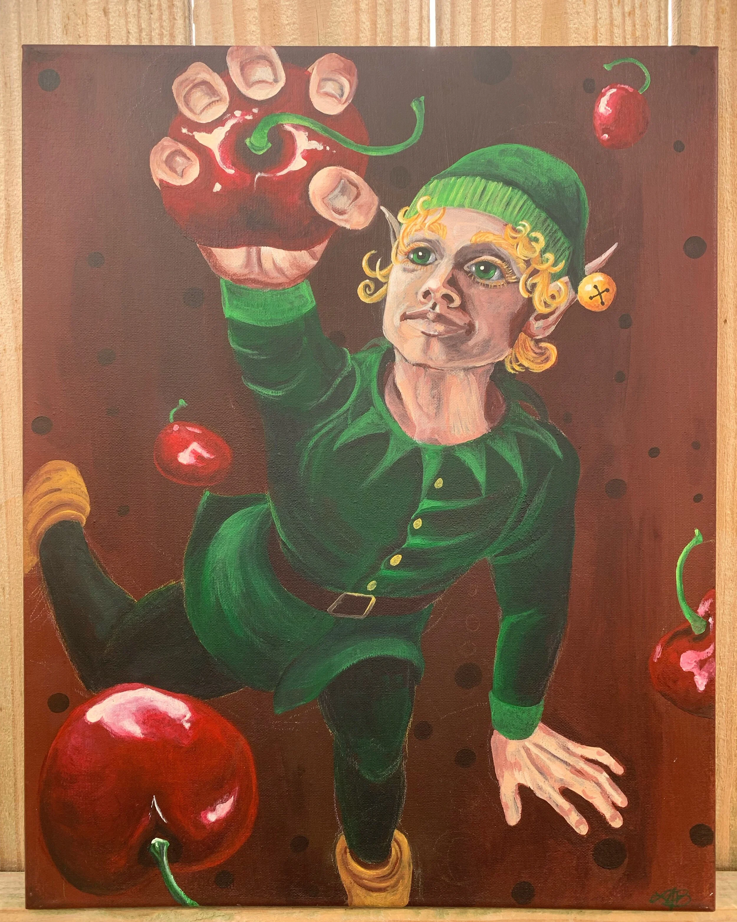 I finally got my stuff together and painted the mad elf I’ve been planning for over a year. Acrylic on canvas.